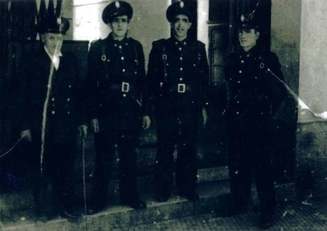 De izquierda a derecha.- Sr. Julian Barrio (Marmoto), encargado municipal de recoger las basuras del pueblo, le ayudaba en este cometido su hijo Joaquin.- Sr. Florentino (Purisima), su cometido era de enterrador municipal, Sr. Cecilio Martín (Calilo), conserje de la Plaza de abastos y Sr. José Miguel (Borrega), conserje de la Plaza de ganados.
