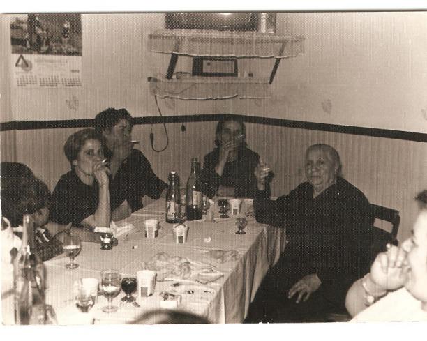 La Señora Luisa (Perala), la señora Pepa, la señora Nieves (de las gaseosas) y la Emiliana (modista de la calle de la Piedad), fumándose un cigarrito con mucho estilo.
