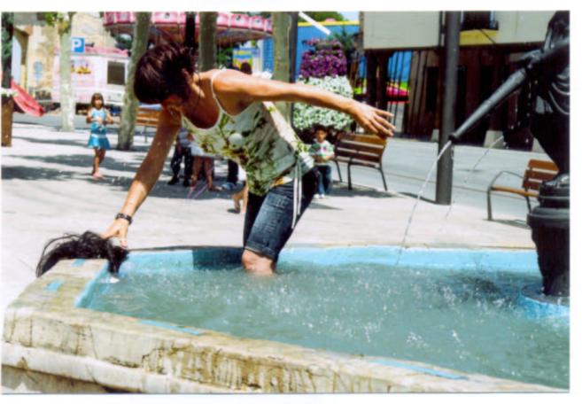 La gente de las peñas se lo pasan en grande en el pilón, aunque también se llevan algún que otro disgusto. Como un año mi hija, que la tiraron y se reía mucho hasta que se dio cuenta que llevaba el móvil en el pantalón... TRAGEDIA DEL MUNDO MUNDIAL! Un beso Lydia, aquí tienes otra fotografía para la colección del pilón. La protagonista no podría ser otra que mi prima Mariló. El pilón y ella sienten una atracción mutua. Esta foto del día del Cangrejo no hace más que rememorar otros momentos similares, sin constancia gráfica, ocurridos durante los veraneos de años atrás. Que yo recuerde mi prima era una asidua del pilón. Un beso para tí y otro, por supuesto, para ella.