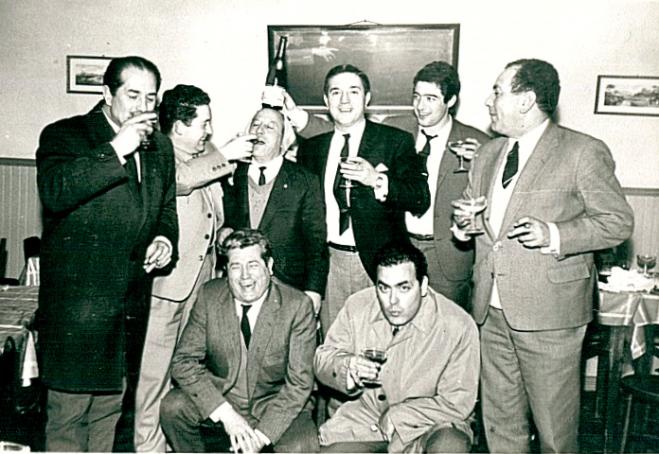De izquierda a derecha: 1 Arsenio Mahamud, 2 Lucidio Martin Calvo; 3 Paquillo, sastre de pañerias Gran Estilo de Palencia, 4 el dueño de pañerias Gran Estilo, no sé el nombre, 5 ¿?, 6 Gonzalo Carpintero. Y agachados, Julio Maestro y Herculano Polanco, director del Banco Hispano.