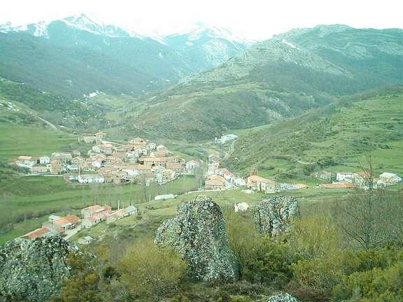 Panorámica de Lores tomada desde los castros de las "Escomuñas" a finales de Marzo de 2004; al fondo valle de Riolores (izquierda) con las cumbres aún nevadas, y valle de Cueva (derecha).