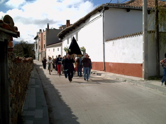 Las mujeres y los mozos que llevan a la Virgen cubierta con el manto negro, van por la calle mayor cantando canticos populares al encuentro de su hijo