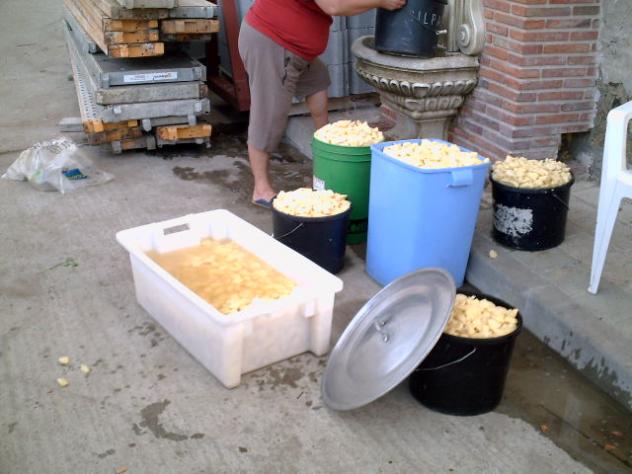 Una vez peladas las patatas y cortadas se lavan y se hechan a las cazuelas para cocer con la carne