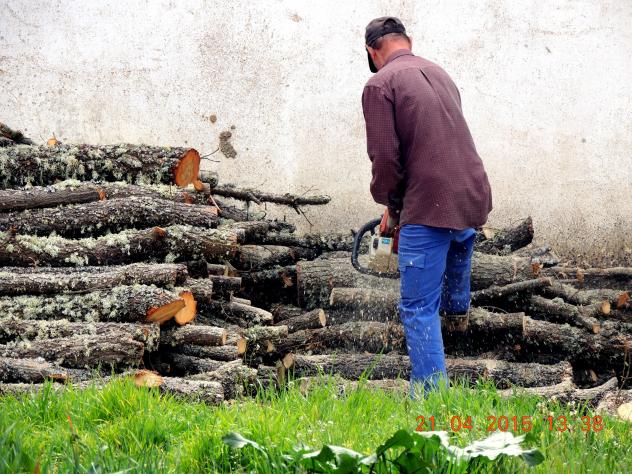 Cortando leña con sierra,