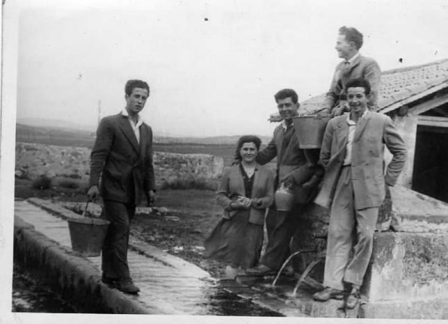 Ana: Esta foto es un documento muy bello: La moza a quién no se poner nombre, está bien oronda rodeada de todos los mozos. Tu tío David, por la cara de crío que tiene, seguro se acababa de poner pantalón largo. El mozo de la derecha me recuerda a Emilio y el que esta sobre la fuente a tu tío Miguel (¿?). Tampoco se del que tiene el botijo en la mano.