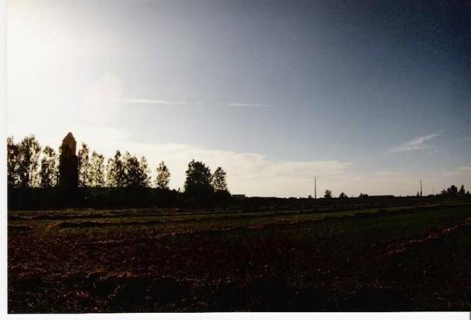 Más parece una noche que una tarde, lo cual impide apreciar lo que parece ser un campo de alfalfa oreándose. Entre chopos jóvenes se alza la espadaña de las ruinas de Calahorra. Queda el palomar al fondo a la izquirda y el contrafoso y Becilla al frente.
