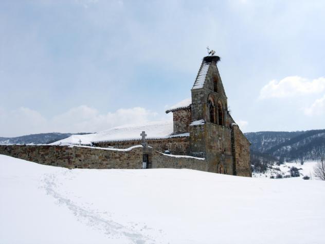 La iglesia oscura sobresale del manto blanco,