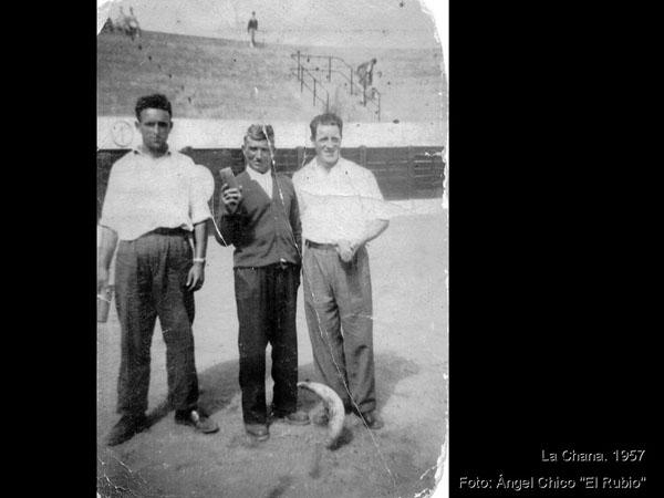 Equipo ganador del torneo de Chana jugado en la plaza de toros de Herrera de Pisuerga en septiembre de 1957, los jugadores son, los vecinos de Herrera Melchor Pérez y Angel Chico, en el centro Arcadio Merino de Calahorra de Boedo.