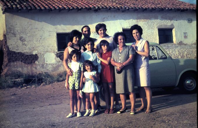 , fotografiada junto a hijos, nueras y nietas frente a la cantina del Sr. Isidro.