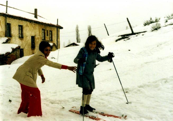 La mujer de Guntiñas con su hija probando esquís,
