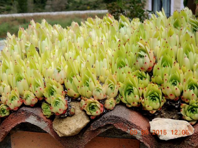 Sempervivum montanum adornando un tejadillo,
