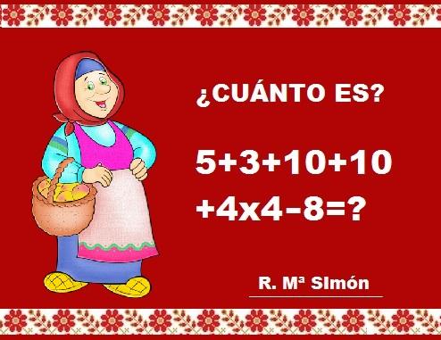 Un ejemplo con paréntesis: 6x (2+7)-12: (2+2)=51... solucción: (120) Si eres amante de las matemáticas, aquí tienes una pequeña ecuación para resolver mentalmente.