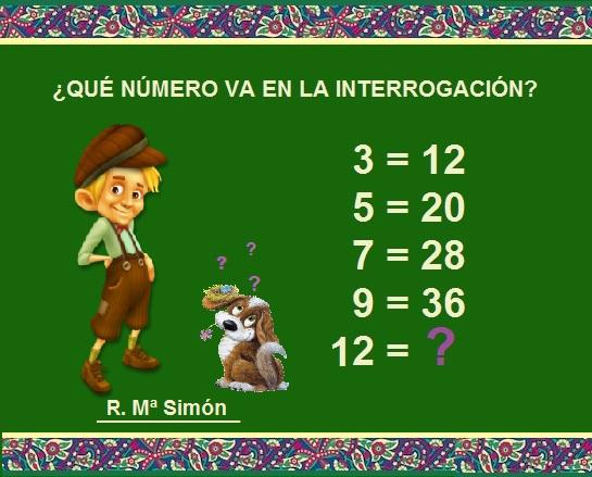 RESPUESTA: Los números de la primera fila se multiplica uno a uno siempre por cuatro, después del = está el resultado- Por lo tanto el número que va en la interrogación es 12x4=48