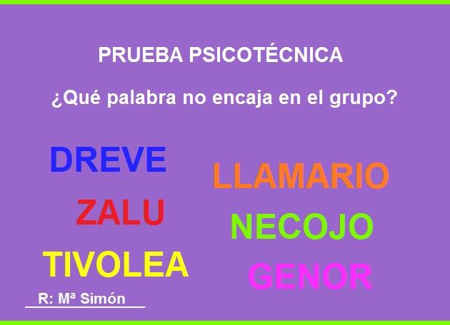 Respuesta correcta y bien detallada. Un saludo marino9 Dreve = Verde <> LLamario = Amarillo <> Zalu = Azul <> Tivolea = Violeta <> Genor = Negro +++ NO encaja "Necojo el Conejo" Saludos. Un anagrama es una palabra que resulta de la transposición de todas las letras de otra palabra. Dicho de otra forma, una palabra es anagrama de otra si las dos tienen las mismas letras, con el mismo número de apariciones, pero en un orden diferente.