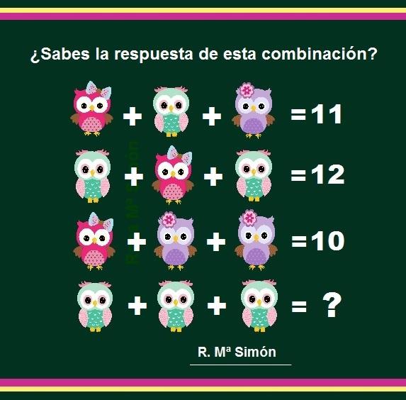 Aquí va la explicación de la pauta que he seguido para llegar al resultado 9. Primera fila valores de 6+3+2=11; Segunda fila (los valores de los extremos son iguales) 3+6+3=12; tercera fila (los valores del medio y de la derecha son iguales) 6+2+2=10; cuarta fila (los tres valores son iguales) 3+3+3= 9. Anónimo 1. Los valores de cada figura y el resultado, son correctos A mí me da 15. Considerándolos como letras, a+b+c=11; b+a+b=12; a+c+c=10, entonces a=2, b=5 y c=4, por tanto 5+5+5=15