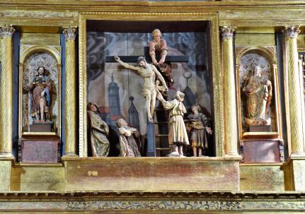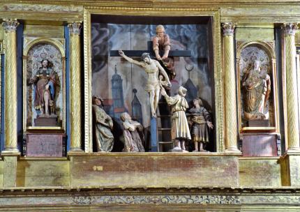 calles y un gran ático. El banco o predela está decorado con cuatro relieves barrocos con escenas de la Pasión. En las calles laterales hay cuatro