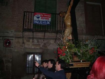 Calvario del siglo XVI, anónimo, de buena talla y ricamente policromado y estofado. El fondo es un