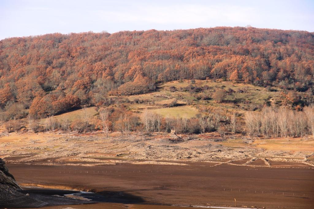 Vista de los restos del pueblo original de Vañes, en su situación original antes de la construcción del pantano de Requejada, en la ladera del sol saliente. Todavía se puede apreciar la zona inferior destinada a huertos familiares y las praderas superiores al pueblo destinadas a las eras.