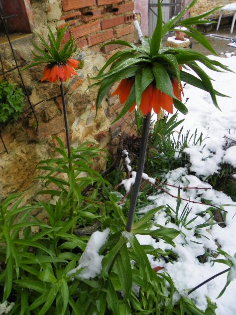 He visto el tiempo, nieve, lluvia, nieve y nieve, seguro que florece como el año pasado entre nevada y nevada ella lució como pocas. un saludo- Y aquí mi fritilliaria con sus preciosas flores un poco a su " rollo " con la altura que tiene ni la inclina la nieve ni se plantea ponerse triste, es una de las primeras en florecer y aguanta bonita bastante tiempo, he visto que este año han salido tres más, al año que viene florecerán y será un rincón digno de otra foto, pero eso al año que viene...