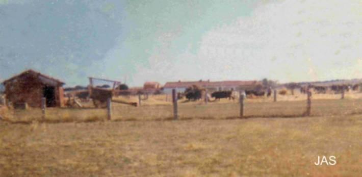 al lado y varias personas trillando con los bueyes. La foto fue tomada en agosto de 1975 desde el