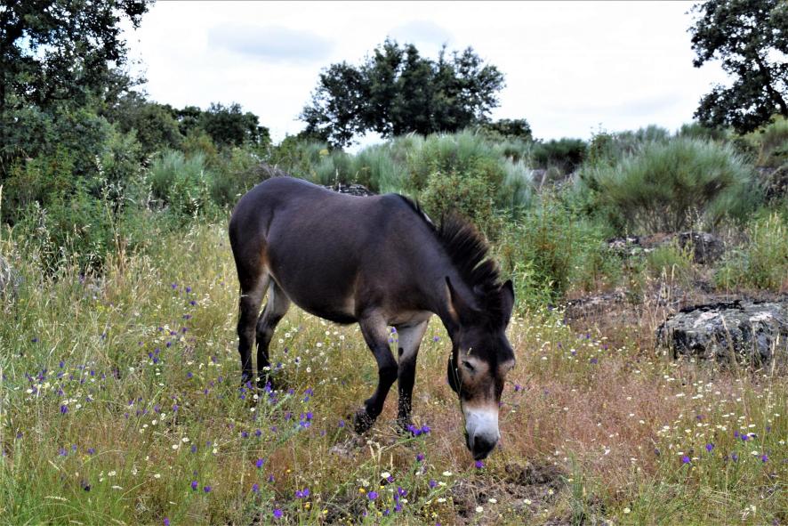 Mula pastando en el campo,