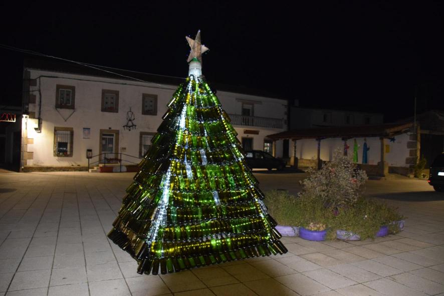 Árbol navideño hecho con botellas vacias en la Plaza,