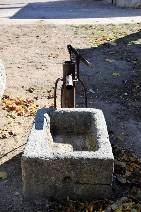 Bomba para sacar agua y pila de piedra,