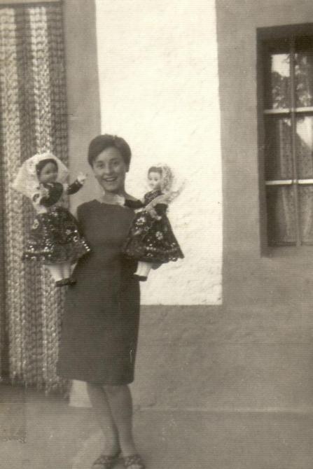 Mari Tere con sus muñecas charras hechas por ella (foto antigua),