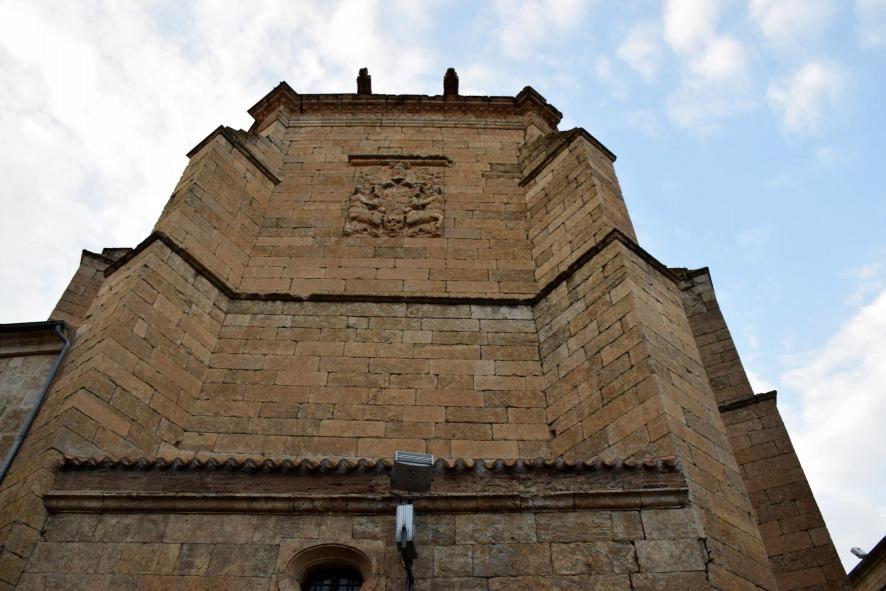 Escudo en fachada de iglesia en la calle Colegios,