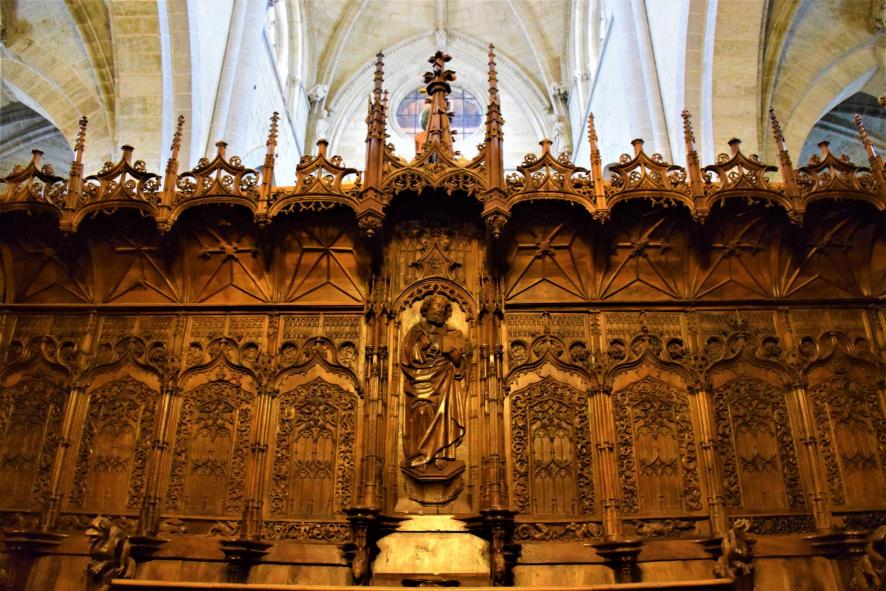 El Coro, tallado a finales del siglo xv por Rodrigo Alemán en estilo plateresco, con grandes influencias del gótico del norte de Europa. Destaca la calidad de la silla episcopal, la única que cuenta con una imagen en el respaldo (San Pedro), pues las demás tienen una no menos interesante labra gótica. En las paciencias y las misericordias, así como en las barandillas de las escaleras, el autor desplegó su imaginación en un sinfín de imágenes burlescas, eróticas y alusivas a fábulas populares.