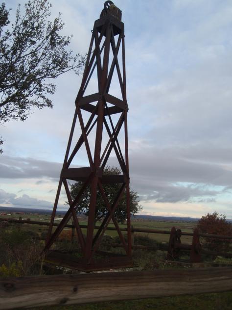 agua) extrayendo el material mediante una caldera de hierro movida por poleas a través de una línea que, partiendo de esta torreta alcanzaba el otro lado de la mina. (Modificado del panel explicativo existente a pié de mina)