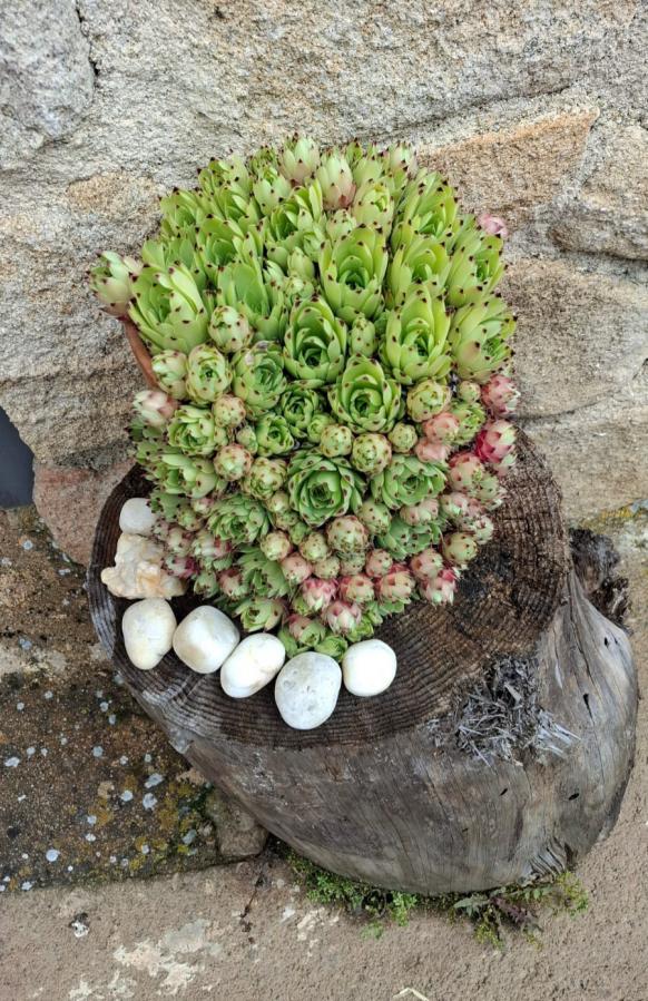 Siempreviva sobre un tronco de árbol en una calle,