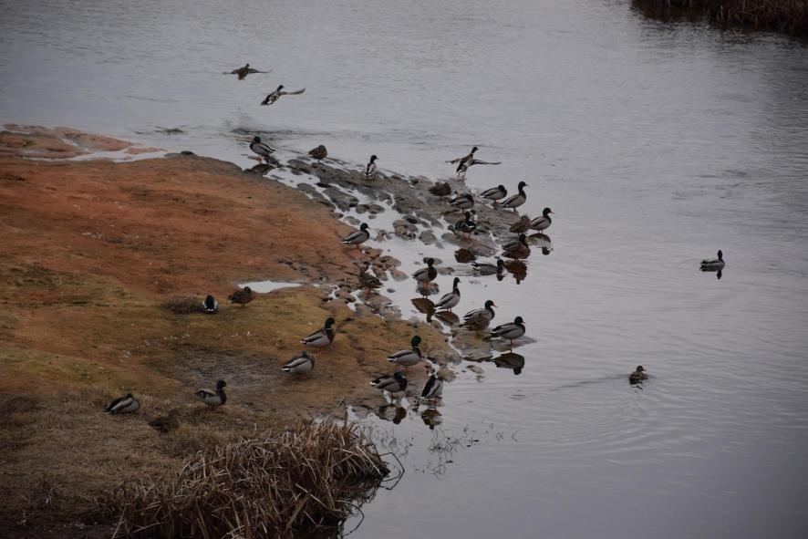 Concentración de patos en la orilla del río,