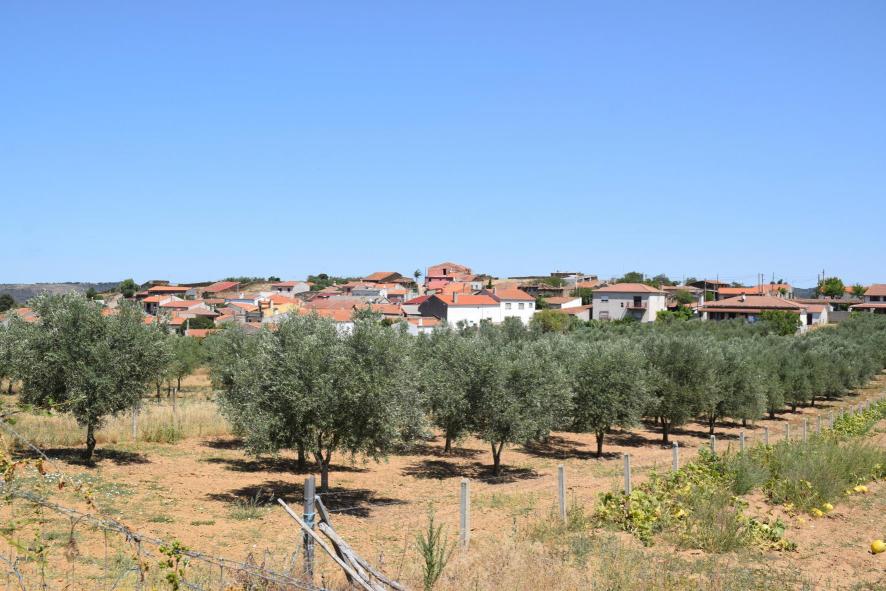 Vista parcial del pueblo detrás del olivar,