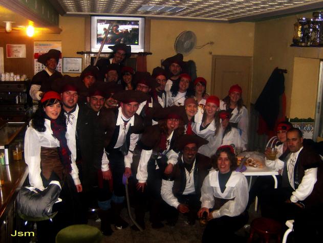 en los carnavales, por lo menos, la noche del sabado, fue muy animada en lo que a disfraces se refiere. Esta es la de mi grupo de amigos, de piratas del caribe. Otros iban de obispos, monjas, (hasta de el papa), marionetas de hilos, indios, abejas con colmenero incluido, luchadores de sumo, geishas, bebes y muchos mas. Lo unico malo fue el frio que hacia esa noche. Por lo demas, estuvo muy bien.