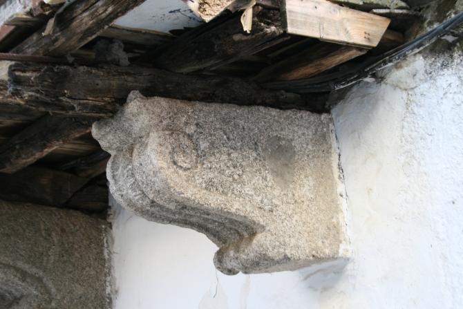 Ménsula de granito labrada y adornada, lo que nos habla de alguien con buen gusto y posibilidades permitirse tal cosa; aunque se trate de un trabajo sin grandes pretensiones artísticas, al menos nos trasmite se hizo, aparte de soportar una carga, para embellecer un fachada con balcones y/o planta superior. También nos informa se trata de una construcción de otro tiempo, posiblemente de las más antiguas del pueblo. El entramado de madera que se observa nos puede llevar a pensar que en la parte superior... [adorno]