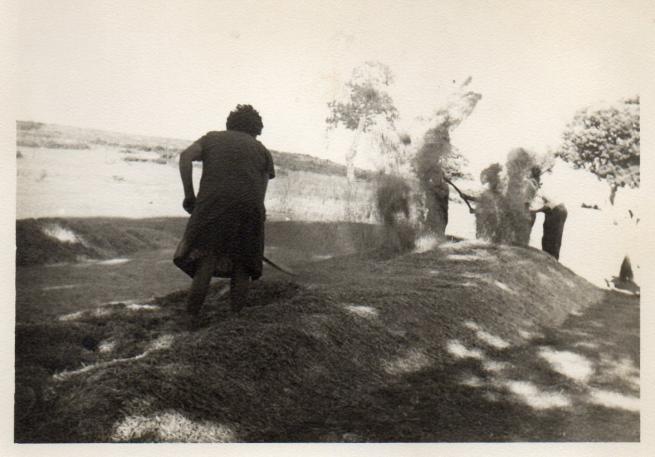 Lagunilla) que aprovechan para limpiar el trigo. Puwede observarse cómo flota en el aire la paja desplazada por la brisa. A cada extro del MUELO dos personas: marido al fondo, esposa de espalda en primer plano, se afanan en aprovechar el viento de media tarde con la esperanza de concluir al final del día. Es la zona de la Rosancha comprendida entre dos