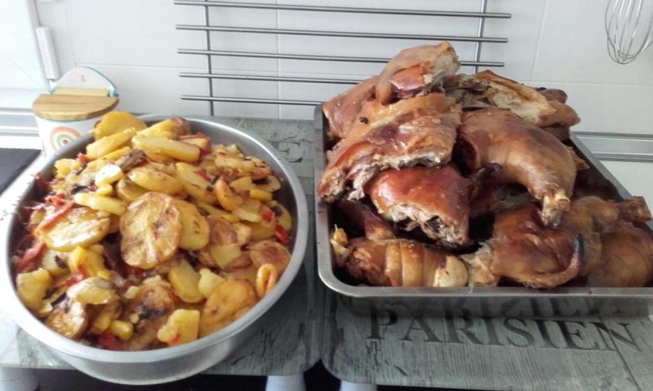 Cochinillo y patatas panadera,