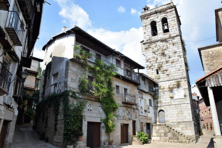 Fachada frente a la iglesia con mucha vegetación,