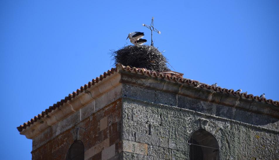 Nido con cigüeñas en la torre de la iglesia de San Bartolomé,