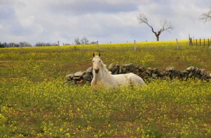 Caballo en un cercado al inicio de la primavera,