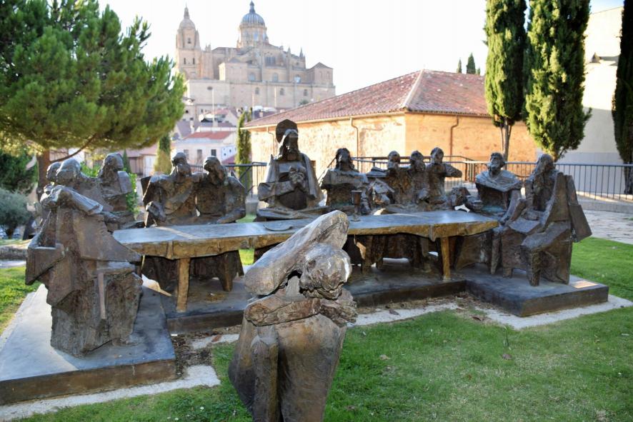 "Sagrada Familia", fechada en 1960, es obra de Venancio Blanco; se trata de una de las primeras obras de este escultor salmantino de Matilla de los Caños y de su hermano Juan. Un error en la disposición de los bebederos fue el motivo de algunos defectos tras el colado del bronce, generando unos espacios en la figura de San José que Venancio decida incorporar al resultado final. Obra del escultor local Venancio Blanco. La fotografía está tomada en los jardines del Convento de Santo Domingo, junto a la sala de exposiciones de igual nombre.