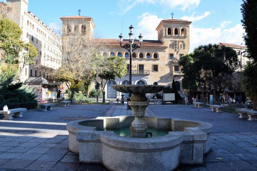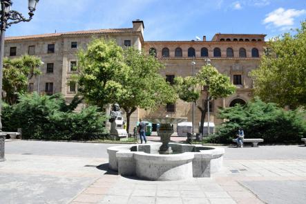 Al fondo el edificio que fue sede del Banco de España en la provincia hasta la desaparición de las sedes provinciales. Con posterioridad, en época de Zapatero se quiso que fuera sede de un museo nacional de arquitectura o algo similar; proyecto fallido antes de su nacimiento; se trato de una más de las promesas incumplidas con esta ciudad y provincia por los gobiernos nacionales (sin importar color) y los regionales. Ahora, con motivo del VIII Centenario de la Universidad durante el presente 2018,...