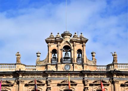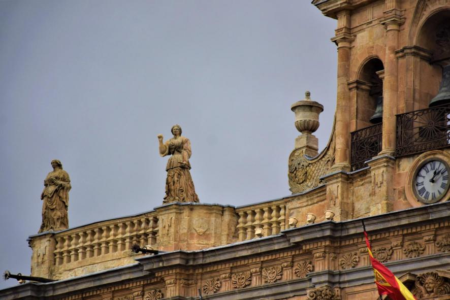Estatuas que representan a la Agricultura y el Comercio junto a la espadaña del Ayuntamiento,