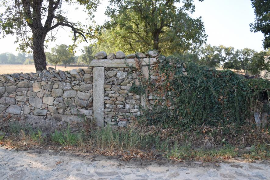 Pared de piedra en seco, donde la puerta de entrada a la finca ha sido tapiada,
