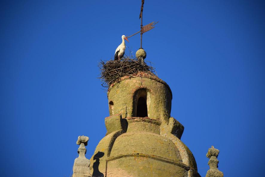 Nido con cigüeña en la torre del reloj de la iglesia parroquial,