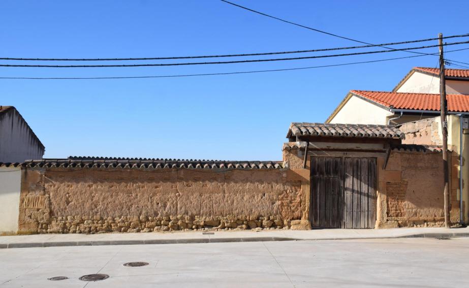 Corral con pared de tapial y puerta carretera,