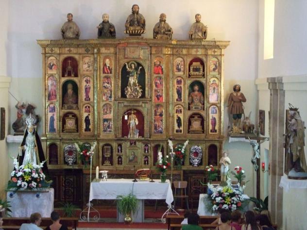 Tengo que informaros, que este retablo fue tallado por Pedro Martín, escultor, y, pintado y estofado por el pintor Alonso Rodríguez, vecinos de alamanca, en 1595. Entre las condiciones, encima de la custodia, había que dejar un enclave, para colocar a Nuestra Señora de la Asunción. Os contaré más cosas, estoy transcribiendo el contrato, que firmó el mayordomo de la iglesia y los artistas.