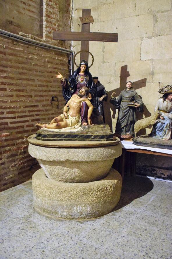 Pila bautismal e imágenes religiosas en la iglesia de San Pedro,