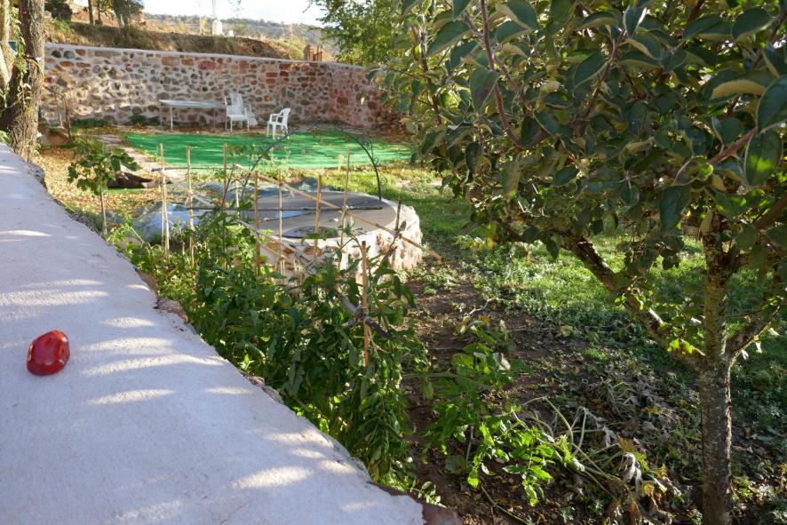 En la parcela, el huerto, el pozo y la mesa con las sillas,